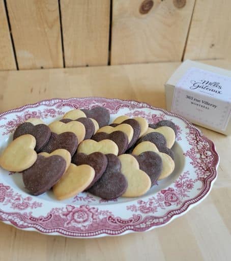Emballage de sablés au beurre en forme de cœur, composé de 12 sablés au chocolat et 12 sablés à la vanille.