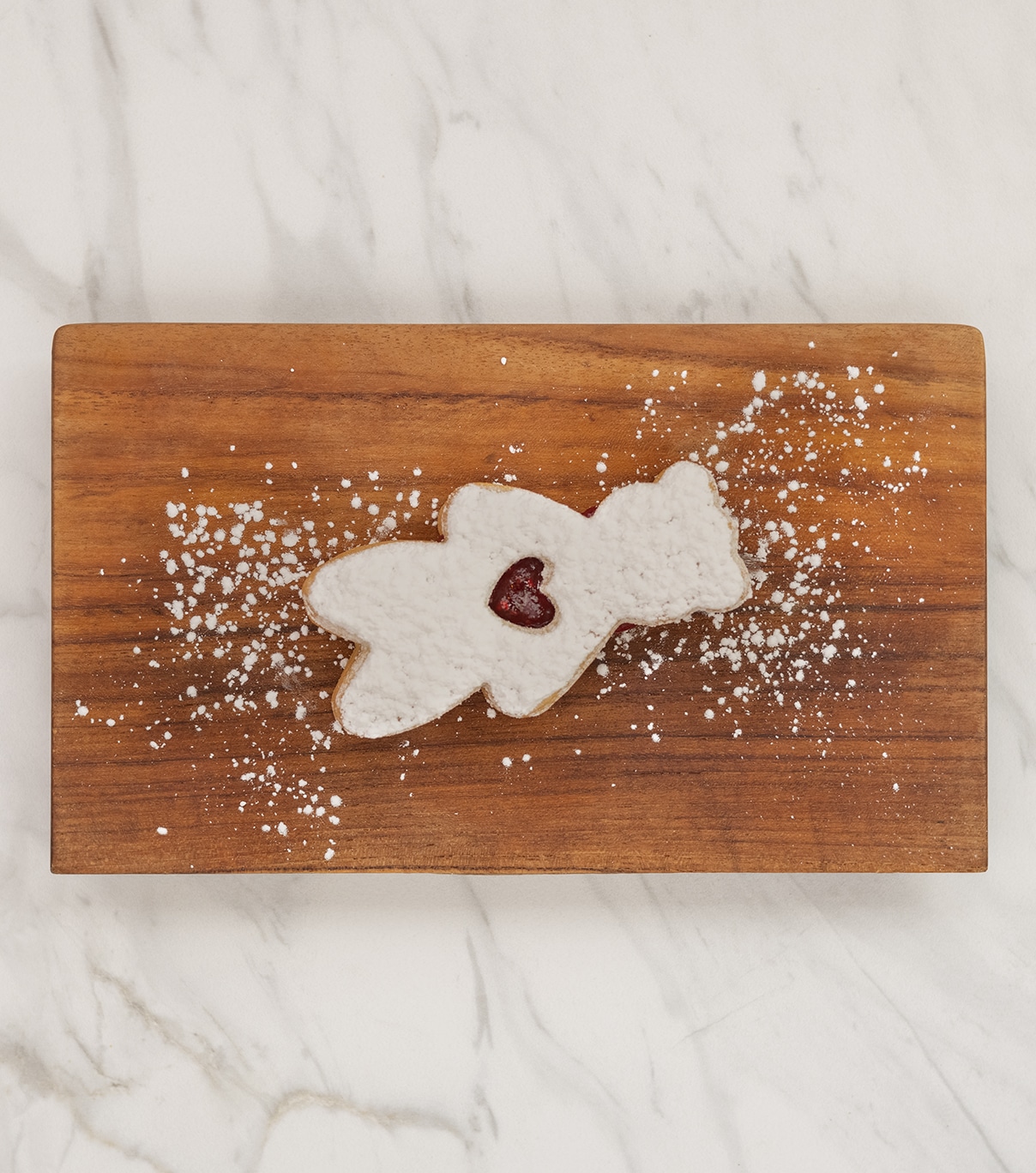 Deux biscuits au beurre à la vanille avec un centre de confiture framboise pépin. Le tout est garni de sucre glace.