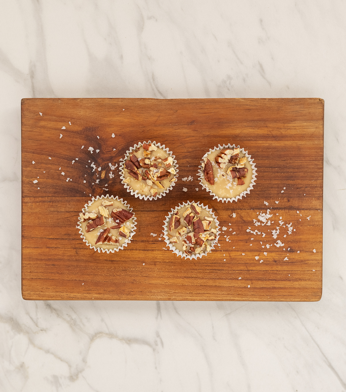 Sucre à la crème fondant garni de pacanes rôties et parsemé de fleur de sel.