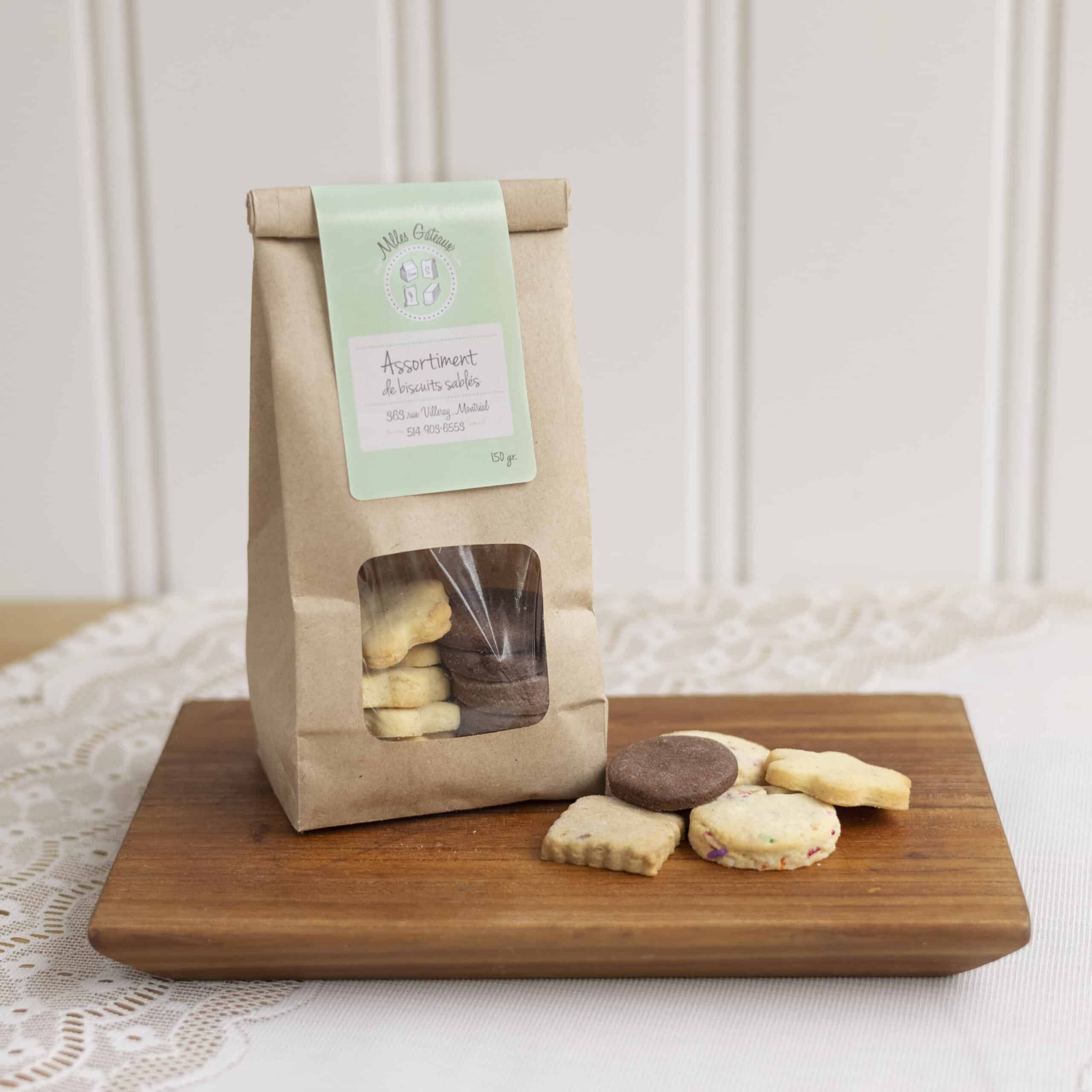 Assortiment de biscuits sablés pur beurre. Marbré choco-vanille, tout vanille, café-noix, épices et bonbons colorés. Emballage de 150 gr.
