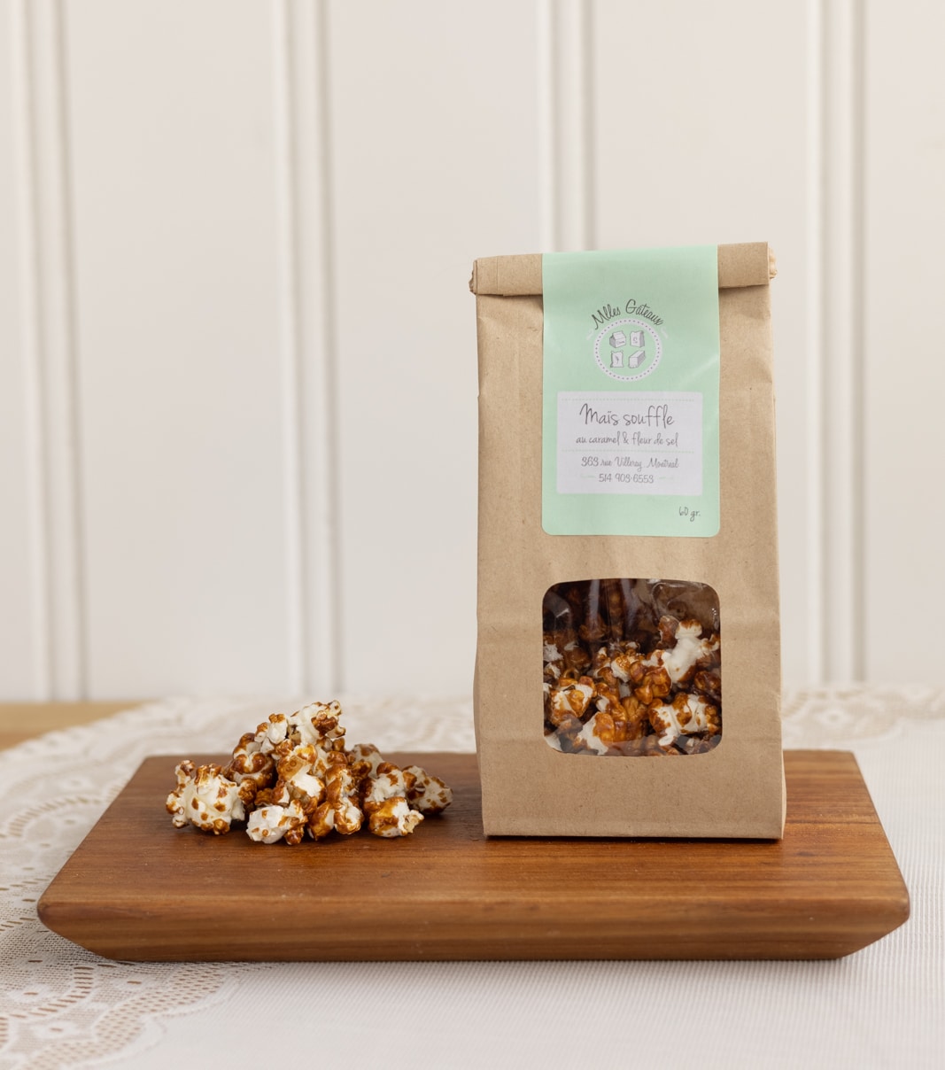 Emballage de maïs soufflé au caramel et fleur de sel.