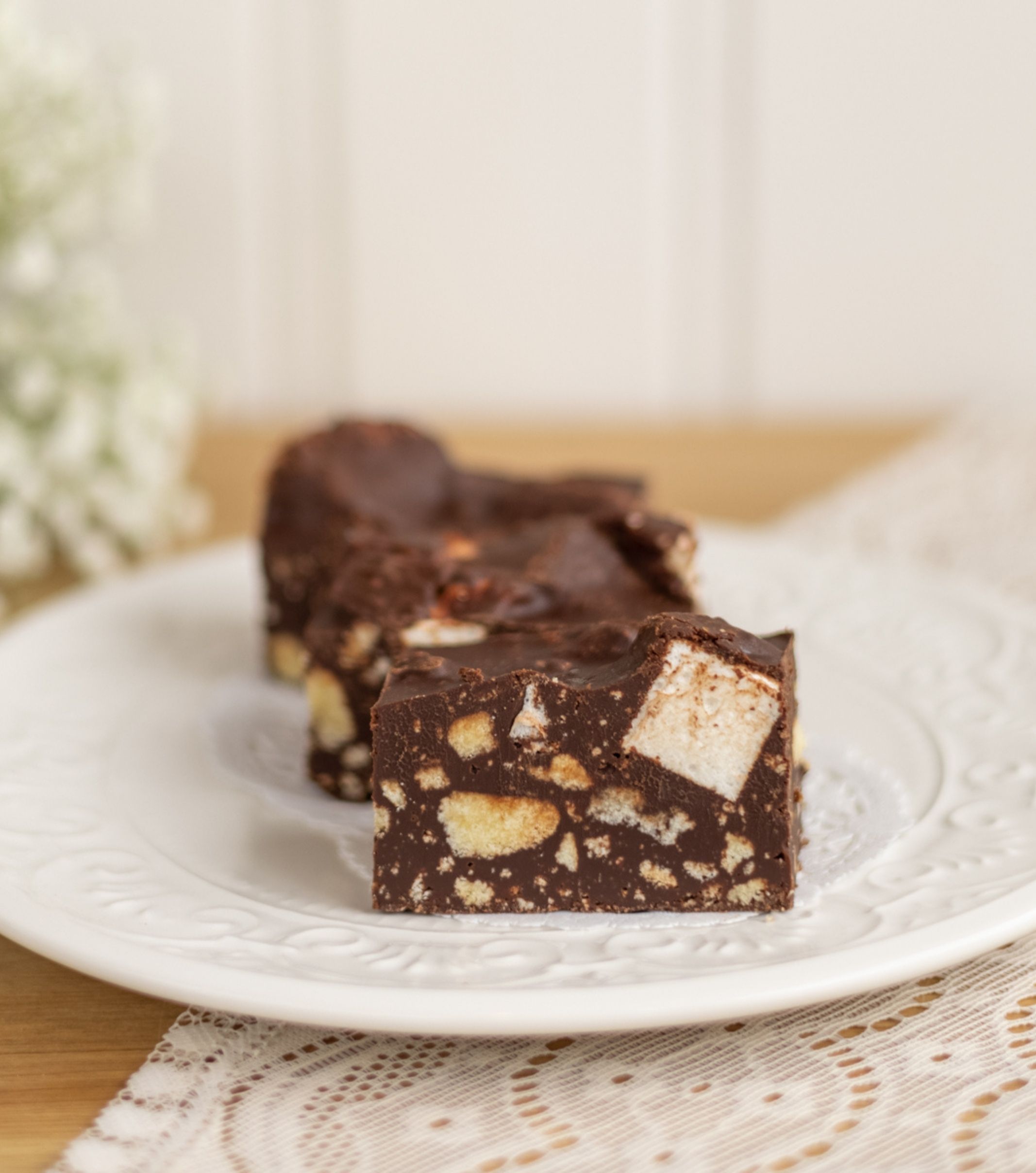 Le fudge préféré de Brigitte, garni de guimauve maison à la vanille, pacane rôtie et biscuit au beurre à la vanille. Délicieux tempéré.