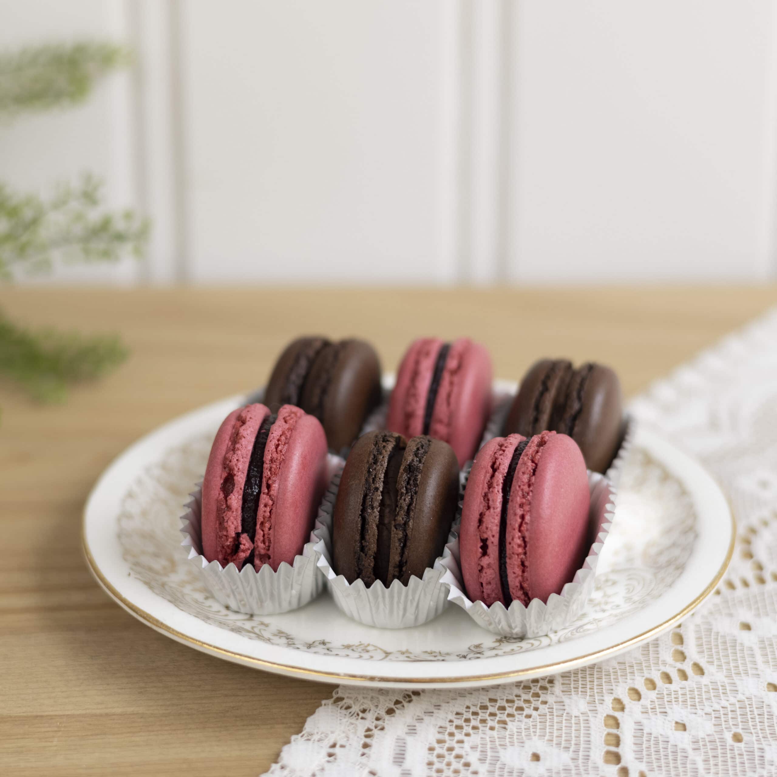 Macaron à la douzaine. Framboise, chocolat, vanille et pistache