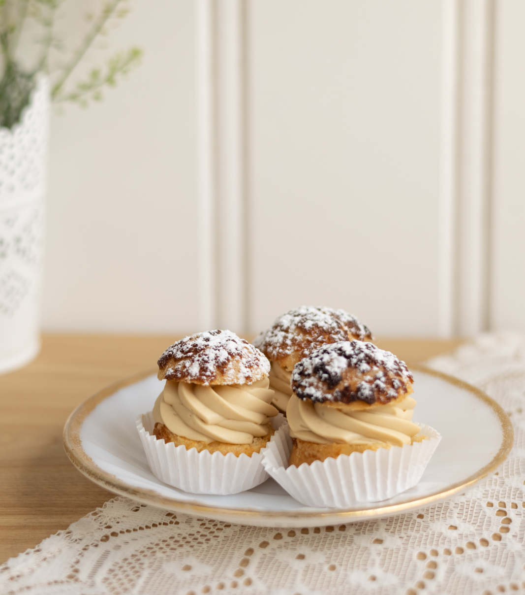 Petit chou croquant avec mousse caramel. Vendu à la douzaine.